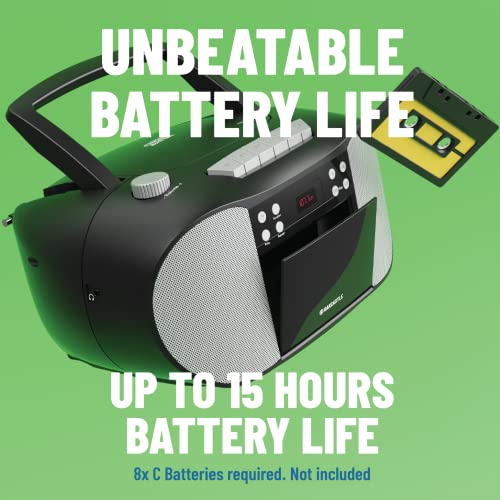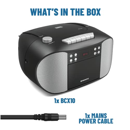 RETRO-KLASSIKER NEU GEMACHT: Der BCX10 haucht der beliebten Boombox frisches Leben ein und bietet eine breite Palette an Funktionen: Kassettenrecorder, CD-Player, UKW-Radio, Kopfhöreranschluss, 2.0-Kanal-Stereolautsprecher, Mono-LCD-Display und batteriebetrieben – benötigt 8 x C Batterien