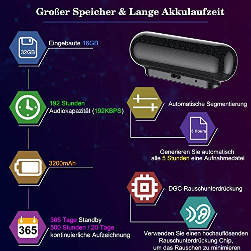 Specification: 16GB Digital Diktiergerät Magnetisch Mini Audio Aufnahmegerät mit Stimmenaktivierung |192 Stunden Aufnahmekapazität|500…