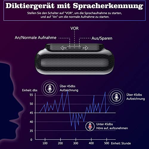 [Aufnahmegerät mit Stimmenaktivierung] Drücken Sie den Schalter in die mittlere Position, um die sprachaktivierte Aufnahme zu starten. Der diktiergerät digital startet die Aufnahme, wenn Ton zu hören ist (mehr als 45dbs), und das Gerät stoppt die Aufnahme, wenn kein Ton zu hören ist. Schieben Sie den Schalter in die Ein-Position, um den normalen Aufnahmemodus zu starten. Drücken Sie den Schalter in die Aus-Position, um die Aufnahme zu speichern und das Gerät auszuschalten.