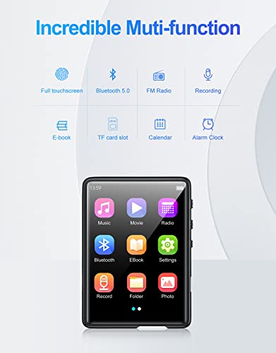 【Multifunktional】 Der MP3-Player unterstützt Bluetooth-Verbindung, Voll-Touchscreen, eingebaute Lautsprecher, Musikwiedergabe, UKW-Radio, Diktiergerät, E-Book (TXT-Datei), Foto-Browsing, Bildschirmschoner, Alarm, Ordner, 23 Sprachen , Kalender und Stoppuhr ect. Perfekt für Sport, Fitness, Laufen, Reisen, Lernen, Arbeiten.