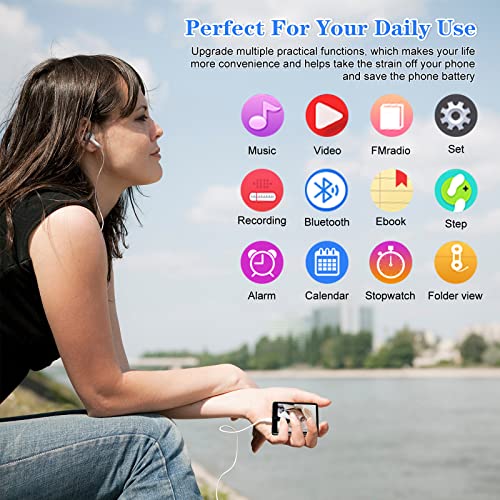 【Multifunktionaler Musik-Player】 Der MP3-Player unterstützt nicht nur Bluetooth-Verbindung und ist mit integriertem Lautsprecher, Musikwiedergabe, FM-Radio, Sprachaufzeichnung, E-Book (TXT-Datei), Videowiedergabe, Foto-Browsing, Alarm, Schrittzähler (nicht unterstützt im Bluetooth-Modus), Ordner, 25 Sprachen, schnelles Zurückspulen/Vorwärts, Zufallswiedergabe, etc. entwickelt. Der solide Metallkörper und die tragbare Größe sind perfekt für Sport, Fitness, Laufen, Reisen, Studium, Arbeit usw.