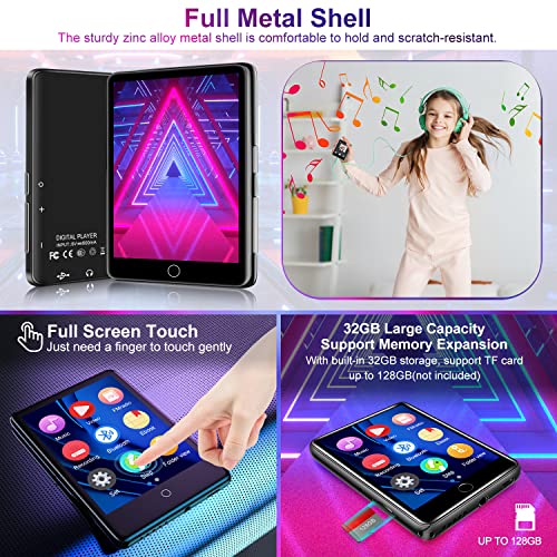 Specification: CCHKFEI 32GB MP3 Player Vollmetallgehäuse mit Bluetooth 5.1, 2,8” Touchscreen mit Lautsprecher, Tragbarer MP3-MP4-Player, UKW-Radio, Recorder, HiFi Lossless Music Player, Erweiterbar auf bis zu 128GB