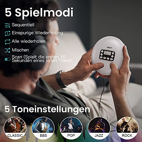 Bequem: Dieser leichte CD-Player bietet alle Standard-Wiedergabefunktionen, die Sie erwarten würden, einschließlich Lautstärkeregelung, Vorwärts-/Rückwärtsspringen, Wiedergabe/Pause, Tastensperre, Anti-Schock usw. / Kompatibilität: CD, MP3, CD-RW, CD-R und WMA. / DIR: Nur für mp3-Disc / 5 Sound-Effekte: BBS, Pop, Jazz, Rock, Klassik.