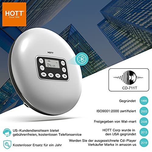 HOTT CD711T Tragbarer Bluetooth CD Player Wiederaufladbarer für zu Hause, unterwegs und im Auto mit Stereo-Kopfhörern…